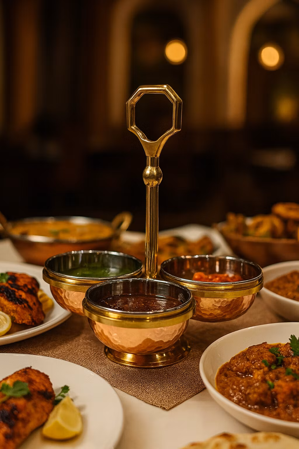 Stilfullt sett med tre skåler i hamret kobber og blankt stål. Passer perfekt til chutney, pickles eller delikate snacks. Et elegant blikkfang til både middagsselskap og restaurantbord.
